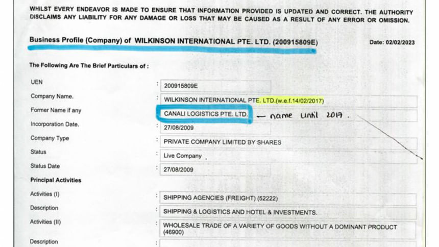 A year after this acquisition, Canali Logistics changed its name to Wilkinson International Pte Ltd, whose assets were worth nearly USD 1 billion (Tk 10,000 crore) in 2021. At the time of writing this report, the Singaporean authorities did not have the 2022 files.