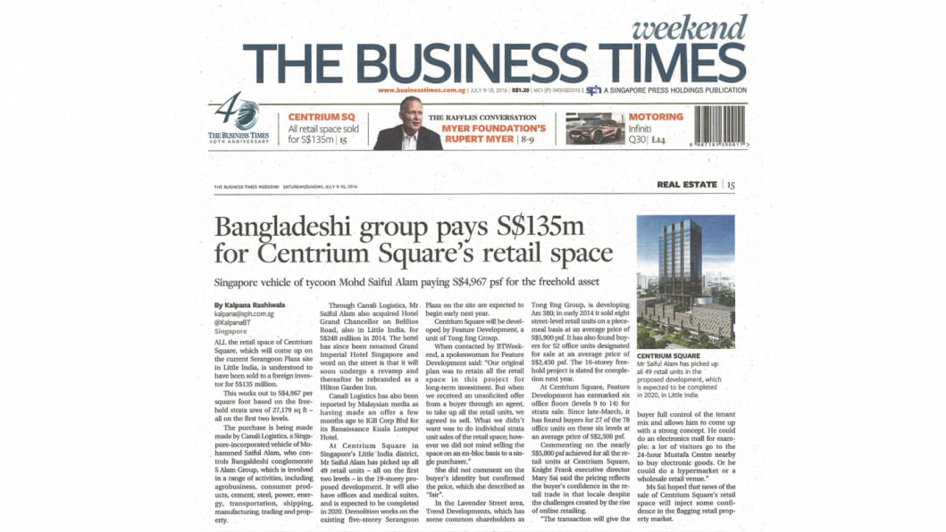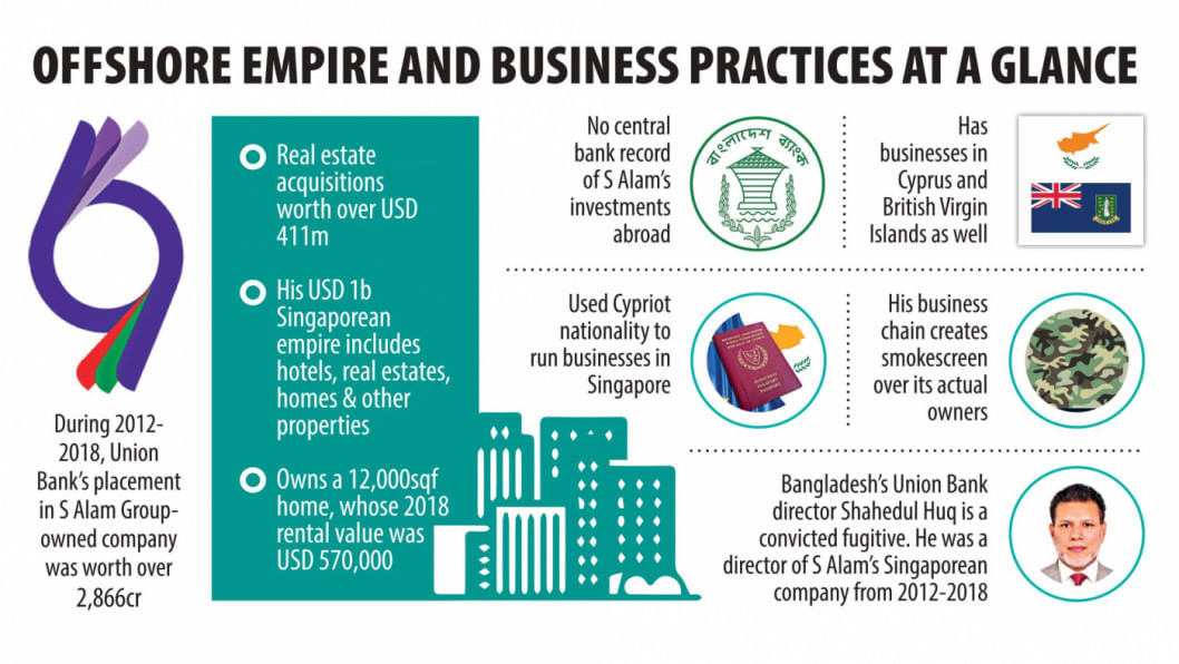 S Alam Group owner Mohammed Saiful Alam has built a business empire in Singapore worth at least about USD 1 billion, although there is no record of him taking any permission from Bangladesh Bank (BB) to invest or transfer any funds abroad, an investigation by The Daily Star has found.